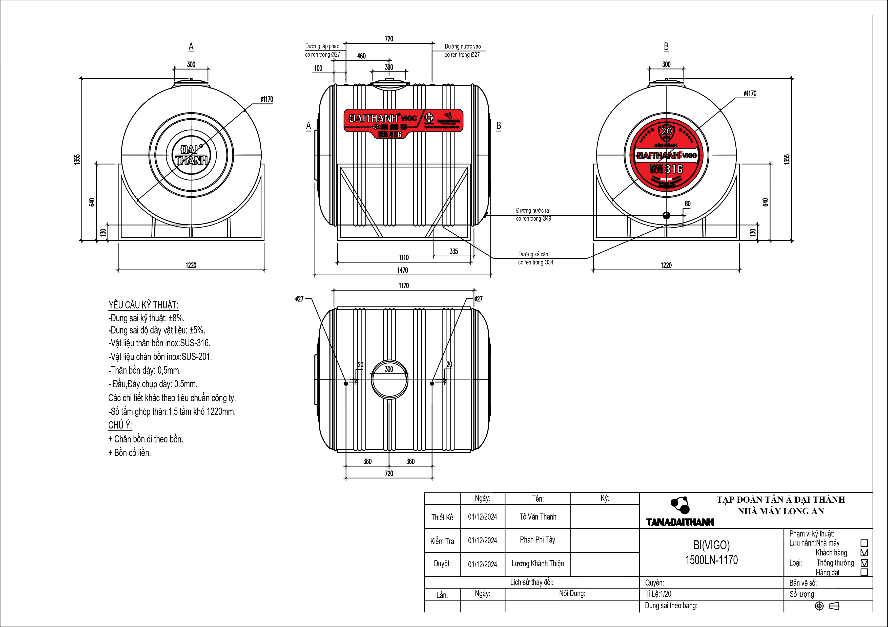 • Thời Gian Bảo Hành: Bồn Inox SUS 316 Đại Thành được bảo hành lên đến 20 năm