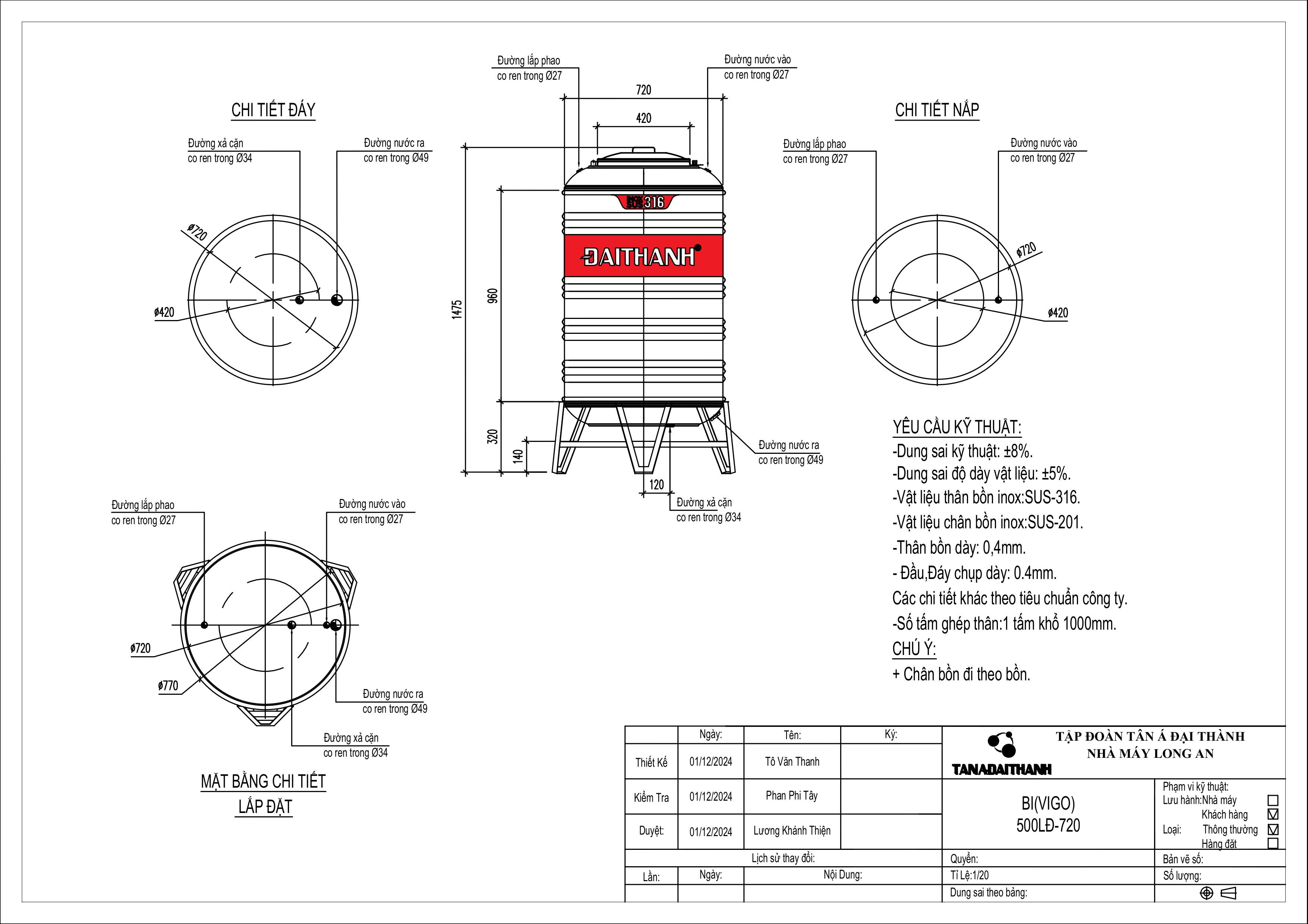 BỒN INOX 316 ĐẠI THÀNH 500L ĐỨNG