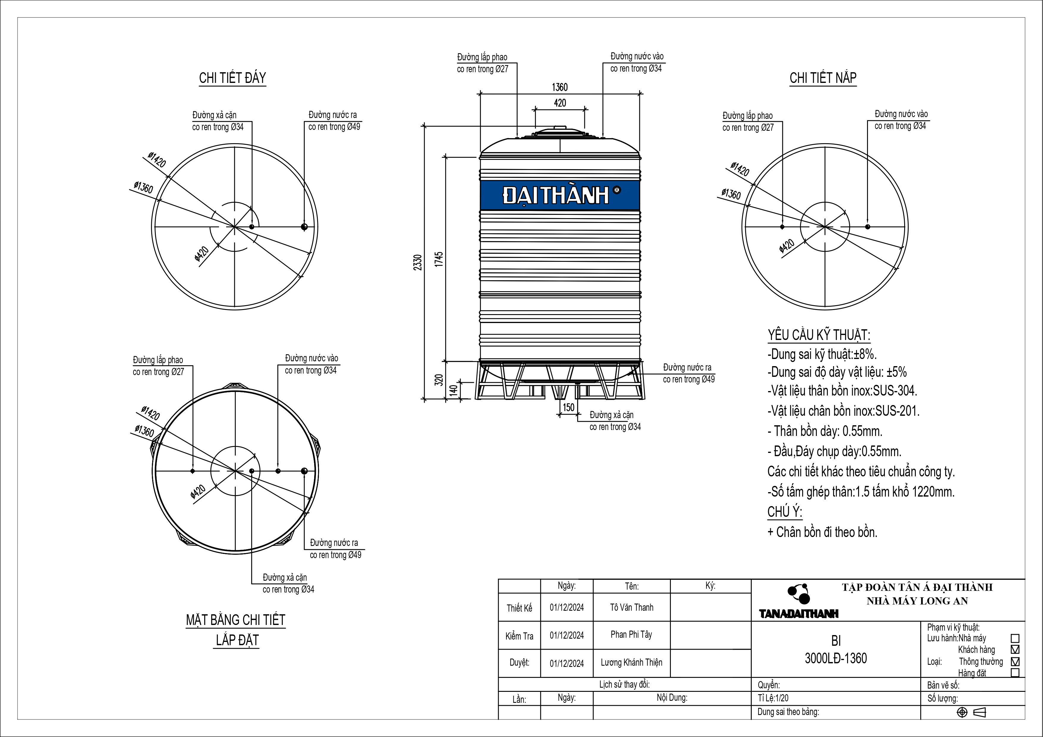 BỒN INOX ĐẠI THÀNH 3.000L ĐỨNG
