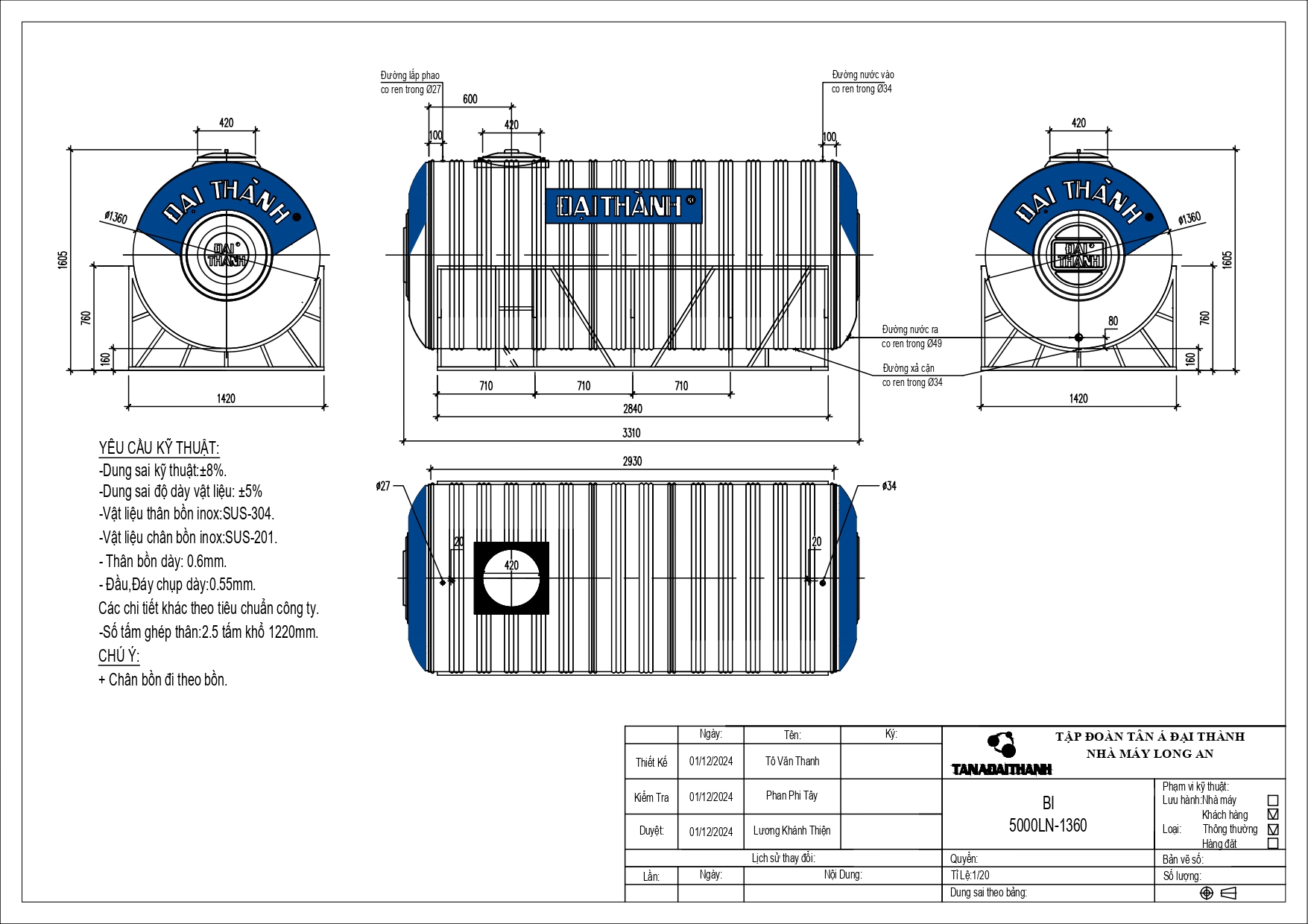 BỒN INOX ĐẠI THÀNH 5.000L NGANG