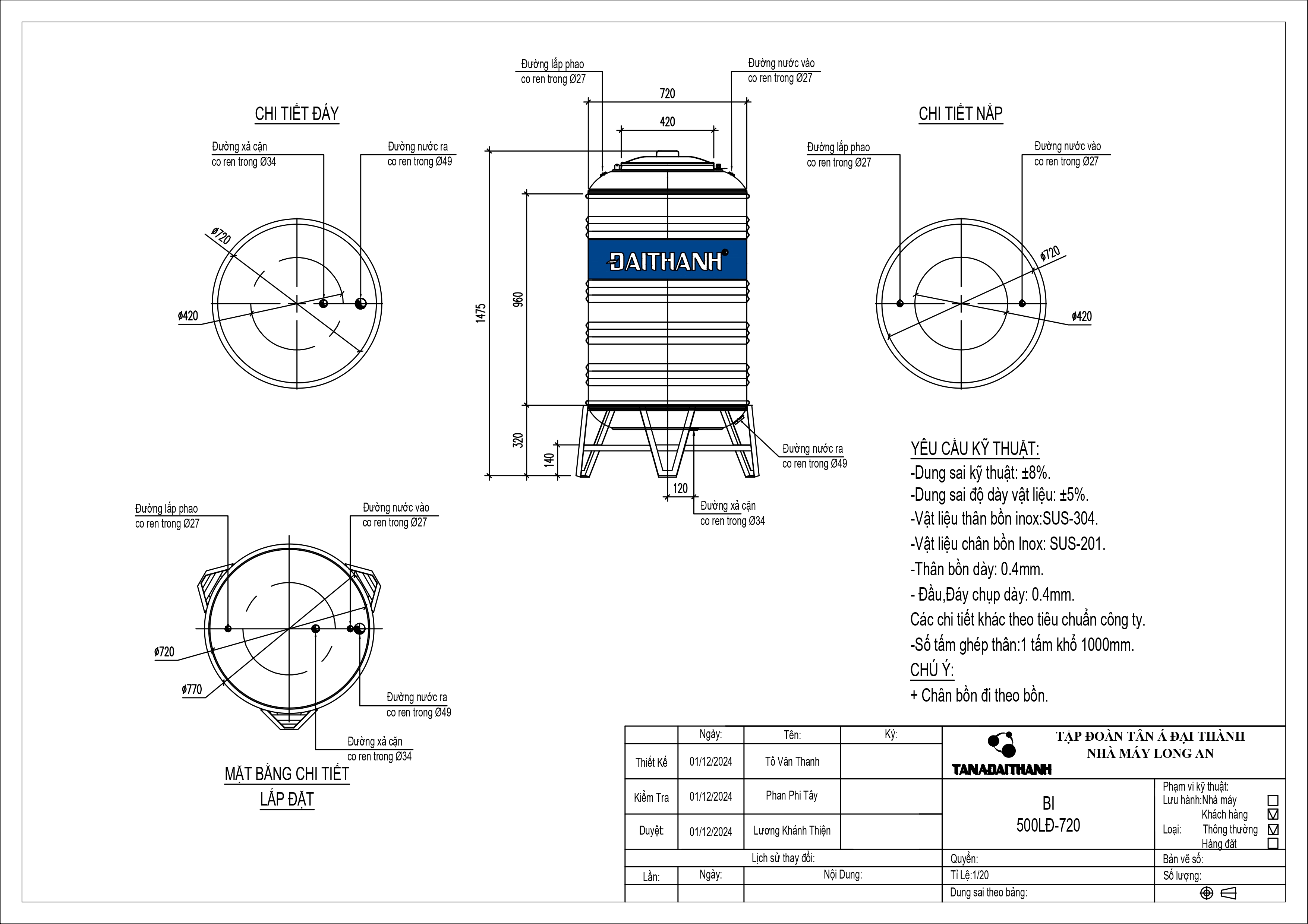 BỒN INOX ĐẠI THÀNH 500L ĐỨNG
