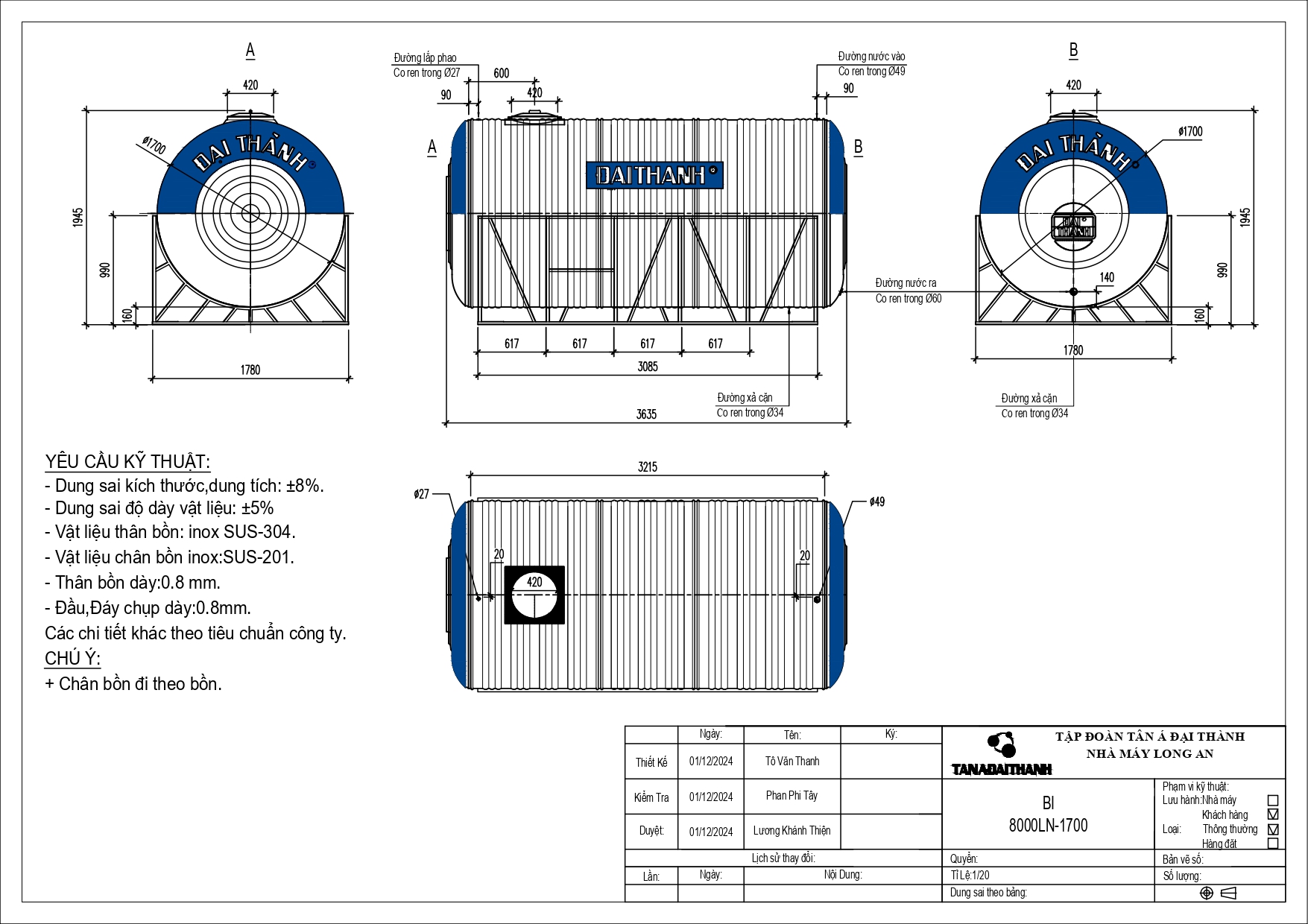 Bồn nước Inox công nghiệp Đại Thành thuộc thương hiệu Tân Á Đại Thành – dẫn đầu thị trường bồn chứa Việt Nam, được đa số các doanh nghiệp & công trình, dự án,… ưa chuộng tin dùng. Đáp ứng tiêu chuẩn quốc tế ISO 9001:2015 và tuân thủ quy chuẩn Việt Nam QCVN 12-3:2011/BYT, sản phẩm nổi bật nhờ: