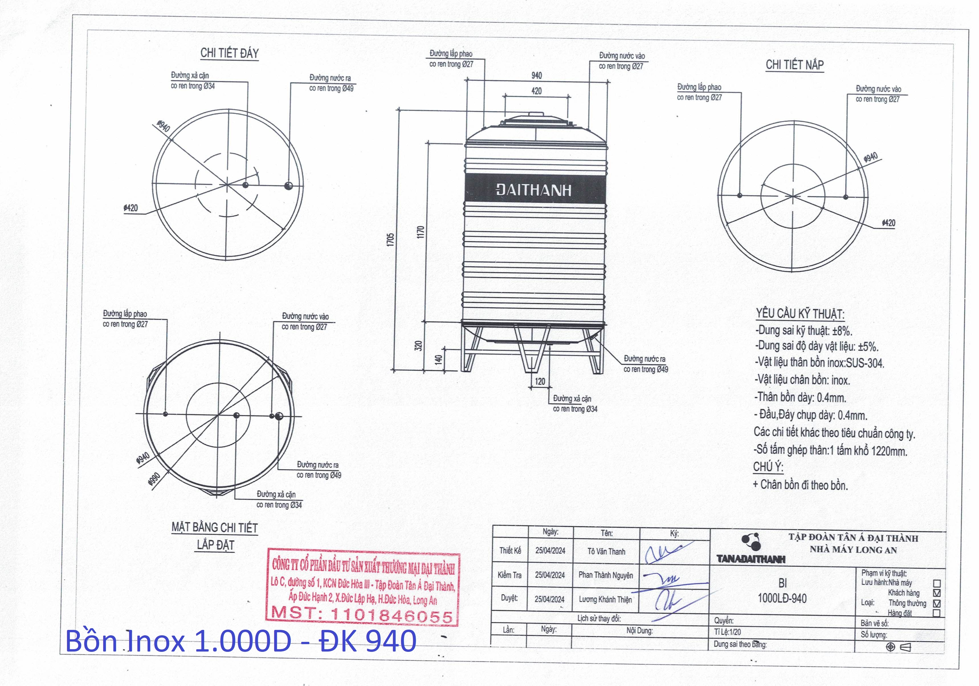 BỒN INOX ĐẠI THÀNH 1.000L ĐỨNG