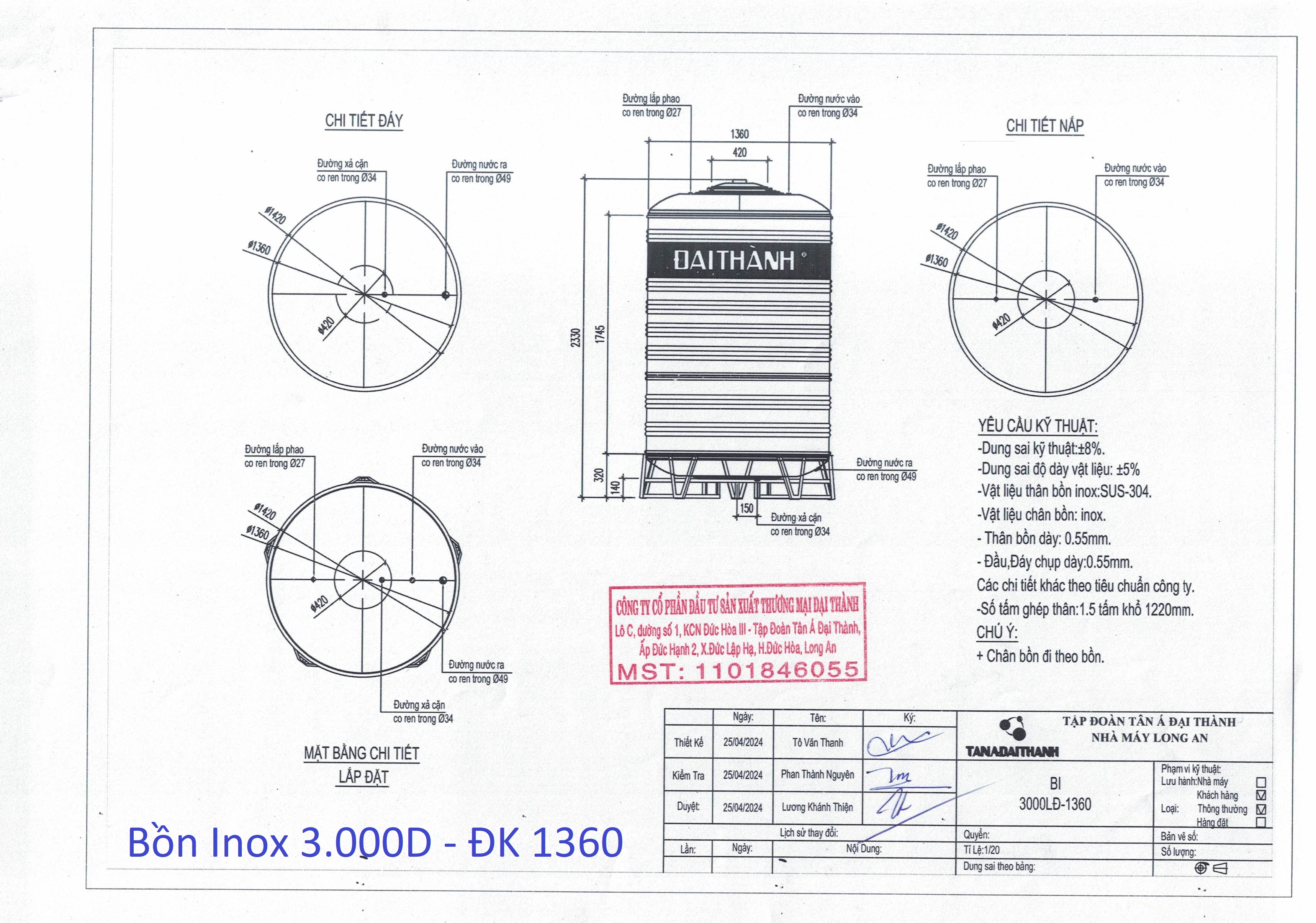 BỒN INOX ĐẠI THÀNH 3.000L ĐỨNG