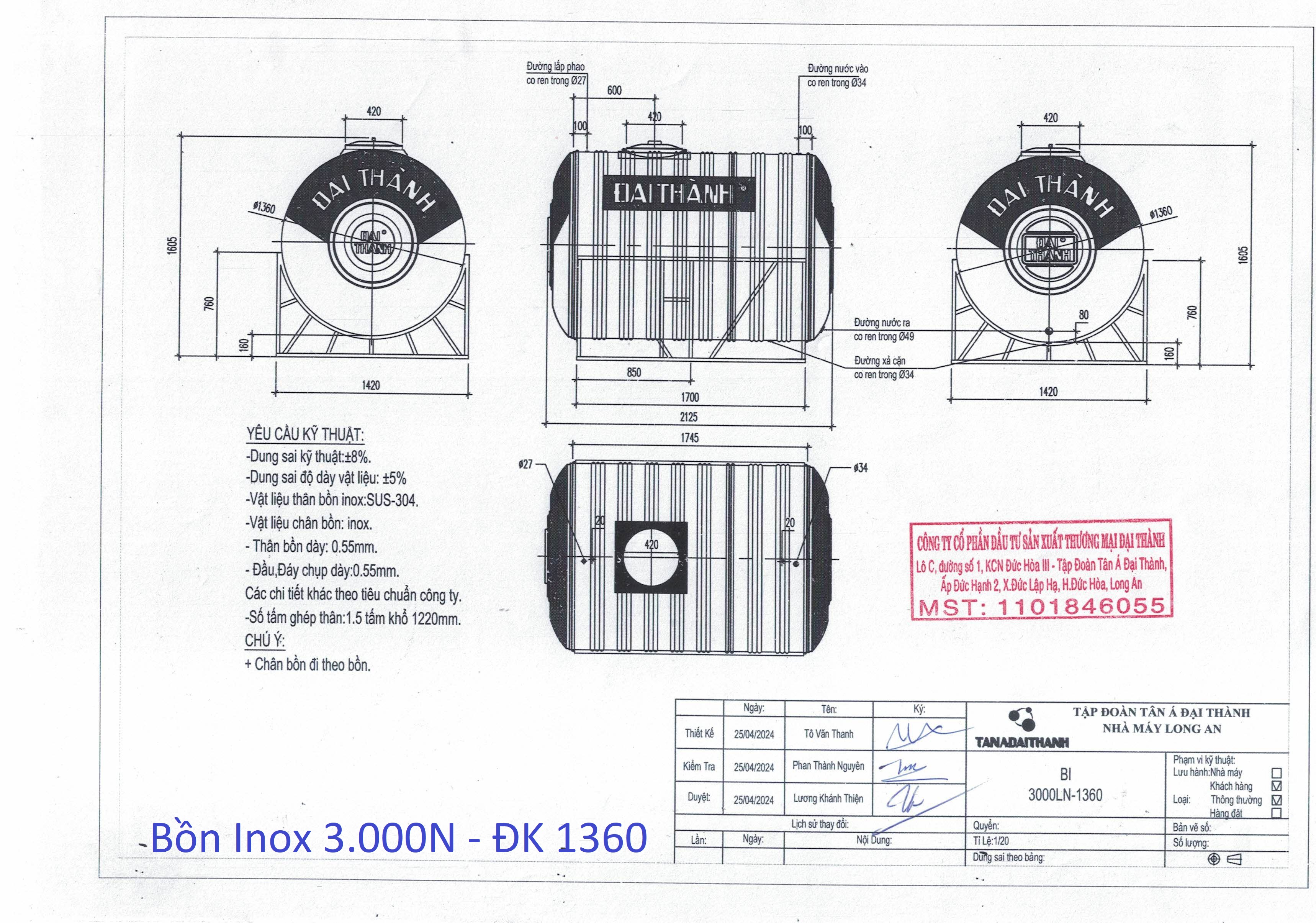 - Bồn nước Inox Đại Thành. Chất liệu: Thép không gỉ SUS 304. Bảo hành chính hãng: 12 năm