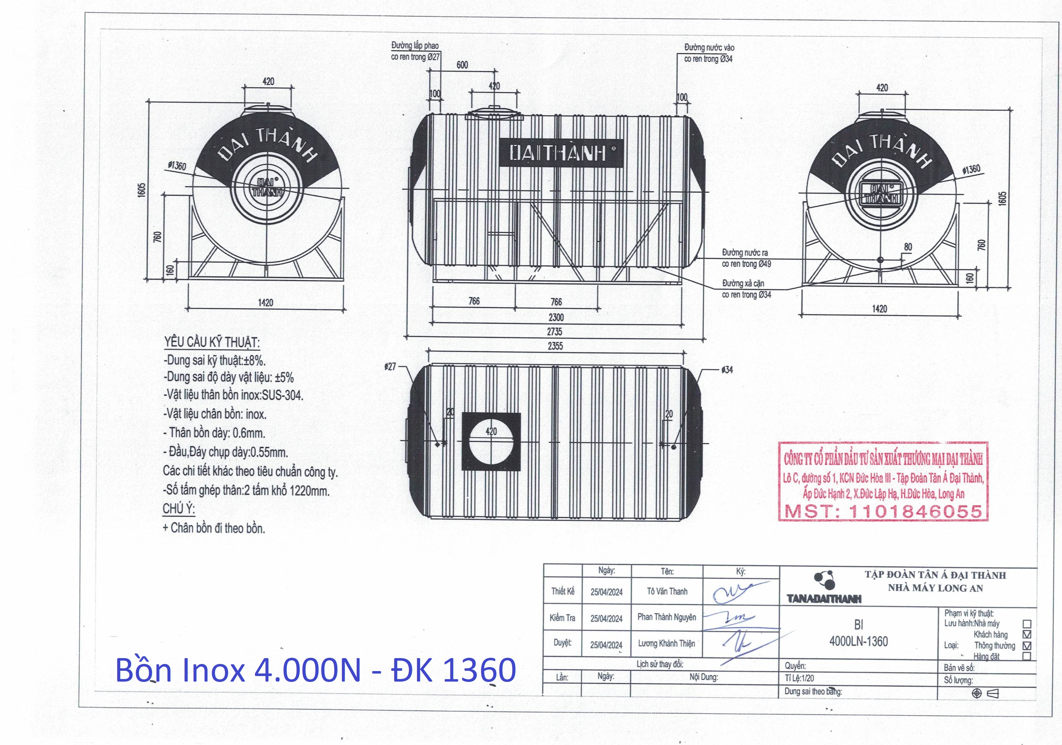 - Bồn nước Inox Đại Thành. Chất liệu: Thép không gỉ SUS 304. Bảo hành chính hãng: 12 năm