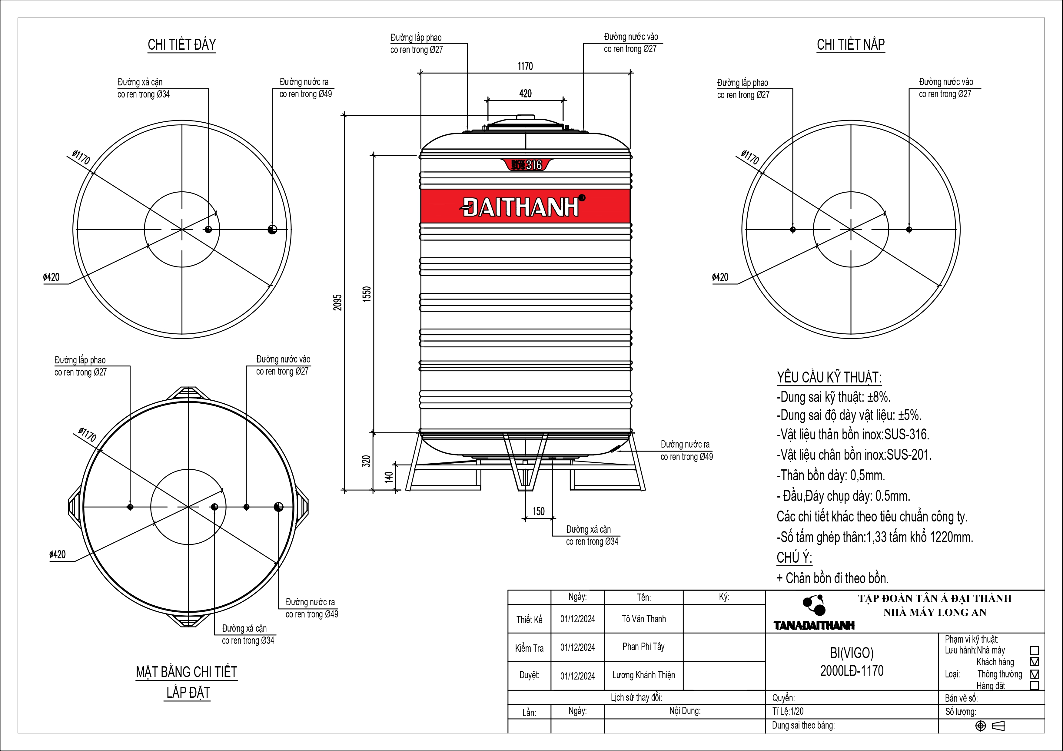 BỒN INOX 316 ĐẠI THÀNH 2.000L ĐỨNG